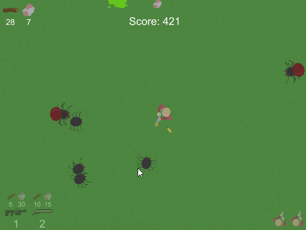 In case you're wondering, the theme of the jam was "Combine two incompatible genres." I tried to do a sort of sandbox survival + twin stick shooter (shooting trees & such to get resources), but due to time restrictions I couldn't put much else in.